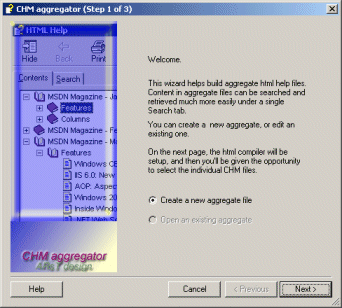 This tool lets you choose whatever combination of CHM files, whether from the same folder or not, give a new CHM file name to put the content into, and then off you go! CHM aggregator extracts the content from all selected individual CHM files, does some processing if required, and then compiles the whole content into a single CHM file.
