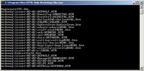 Once the extraction is completed, the compilation phases begins. The compiler from the HTML Help workshop component is a dos-based process, which is the reason why you see a window like this :