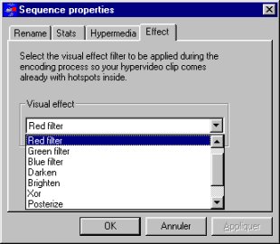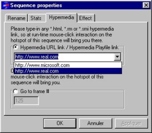 While the informations are optional, as we said earlier, it's of primary importance if you consider encoding videos out of your work. When you encode to the AVI file format, for offline, the hotspots are encoded using a visual effect filter, thus if you don't choose any, the default red filter is applied.When you encode to the RealG2(R) format, for the Internet, the hotspots are encoded using a visual effect filter, and you should have chosen one. In addition to visual effects, the RealG2(R) streaming format explicitely makes live interaction a reality, and the encoding process is a unique opportunity to associate a hotspot to an action : URL browse, Playfile, Go-to somewhere in the video, and a caption. Don't miss it !!