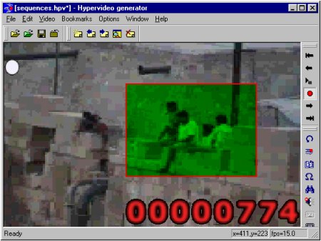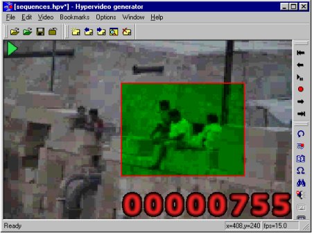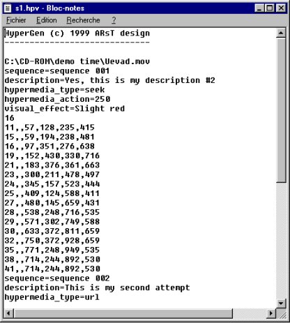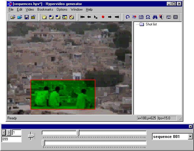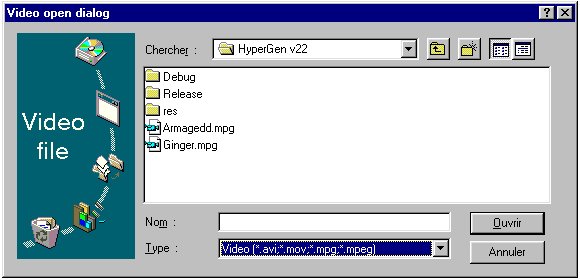 The video file, if ok, is opened and associated to the hypervideo data. Its name will be saved into the HPV file. Of course, it is possible to open another video file for the current hypervideo data but that would be a bit silly. The fact that the OPEN HYPERVIDEO FILE and OPEN VIDEO FILE are two distinct functions is that when you start HyperGen, or when you close the current hypervideo file, you work with an empty hypervideo context, and needs to associate a video to it before proceeding, and at any moment you may wish to open another hypervideo file.