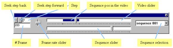 At the left of the frame position slider, is the frame rate slider. This slider is quite unusual but really useful. It is not a feature of the famous Microsoft Active Movie control since the latter is a pure simple playbacker.You can select the desired speed of the video playback. Since the start and end of the sequence are very often precise positions and since you can't do good job at 25 frames by second, it's actually a good idea to slower the video frame rate when you are working with a video. Upper positions of the vertical slider are slower frame rates. The most upper position corresponds to a tenth of the full frame rate. Try it !!! It's quite impressive since the audio is also slowed by a factor of ten. What awful sounds...The most downer position corresponds to a doubled full frame rate. It's almost only for joke purpose !! The middle position is full frame rate.