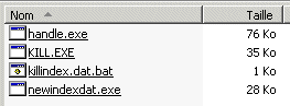 Killing all processes except explorer.exeKilling all processes unlocks index.dat files. Since killing  To kill a process, you need to type  All in all, the resulting output of handle should now look like the following :  All applications locking index.dat files are killed, except explorer