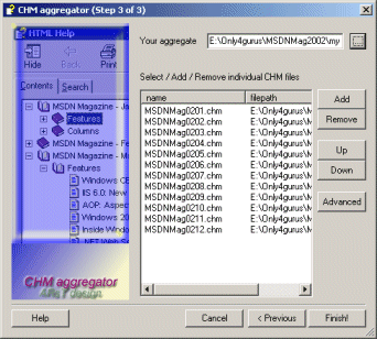 In our example above, just start CHM aggregator again, reproduce Step 1 and 2 as explained in the previous section and then, in Step 3, just before you push the Finish button, don't do it until you've clicked on the Advanced button.