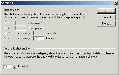 Shot sampler settingsAlthough the settings look a bit complex at first sight, it's really simple. The shot sampler does its job based on the sampling rate. Because the sampling rate varies a lot depending on the size of video, some are very short (trailers), some are very long (full movies), and because users may wish to choose a rate with absolute or relative figures, there is an option to choose from. By default, this option is the fourth, which means that once the shot sampler is started it will extract and create one shot every 40 frames of video, which for most videos roughly equates to 1 shot every second. If you replace 40 with 200, then you'll notice that 5 less shots will be extracted and created. Because the way you expect shots to be produced may depend on how you see video clips, you can choose another option, among which :